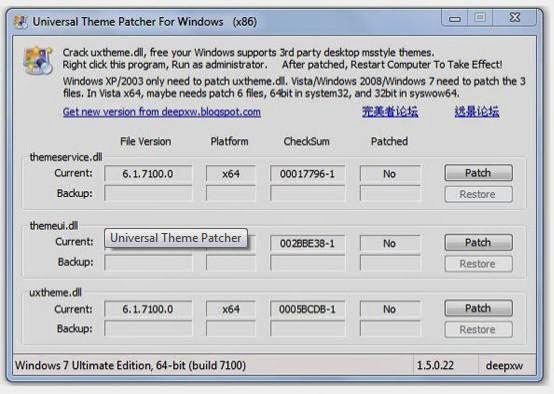 Patch Uxtheme (Once patched, UxTheme can be restored (Program > Restore UxTheme)